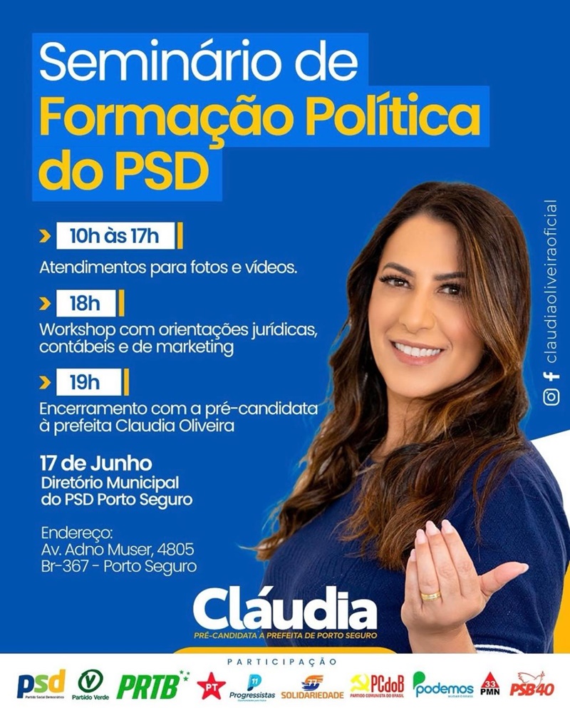 O diretório municipal do PSD – Partido Social Democrático – de Porto Seguro vai promover, na próxima segunda-feira, 17, o Primeiro Seminário de Formação Política, voltado aos pré-candidatos a vereador do próprio partido, bem como dos partidos que compõem a base de apoio à pré-candidatura da deputada estadual Cláudia Oliveira, para o pleito de 2024.