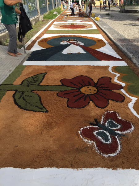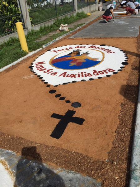 Antes da procissão, pela manhã, as ruas foram ornamentadas pelo fiéis com os tradicionais tapetes coloridos inspirados em motivos religiosos. A decoração é feita a base de serragem e pó de serra, além de cal, xadrez, pó de café, cascas de ovos, frutas secas e anilinas, para fortalecer o colorido.