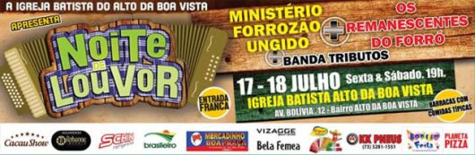 IGREJA BATISTA ALTO DA BOA VISTA NOITE DE LOUVOR – 17 e 18 DE JULHO DE 2015 Viver em comunhão é algo primordial para o desenvolvimento de um evento, pois quando estamos juntos em busca de um propósito, este é alcançado com êxito. A Noite de Louvor está em sua 3ª edição, com o objetivo da confraternização entre amigos, familiares e comunidades vizinhas. Tanto esta edição quanto às passadas, tem por finalidade angariar fundos para a compra do terreno da comunidade, buscando os valores familiares e do reino de Deus. A festa conta com a alegria das barracas e comidas típicas da época, lembrando antepassados bíblicos e comemorações semelhantes em outras regiões do país, como a “Festa do Milho”, que acontece por ocasião da safra. “Israel comemorava a festa de Pentecostes por conta da colheita. A origem do Pentecostes vem do Antigo Testamento - uma celebração da colheita - (Êxodo 23, 14), dia de alegria e ação de graças, portanto uma festa agrária”. Vale ressaltar que todo esse evento conta com a ajuda e a colaboração de parceiros. A participação é de todos os membros da igreja, que preparam tudo com amor e dedicação para os convidados que nos prestigiam com sua presença. Sendo assim, nós da Igreja Batista Alto da Boa Vista, agradecemos desde já todas as colaborações e doações, pois através delas alcançaremos novas vidas e conquistaremos novos alvos.
