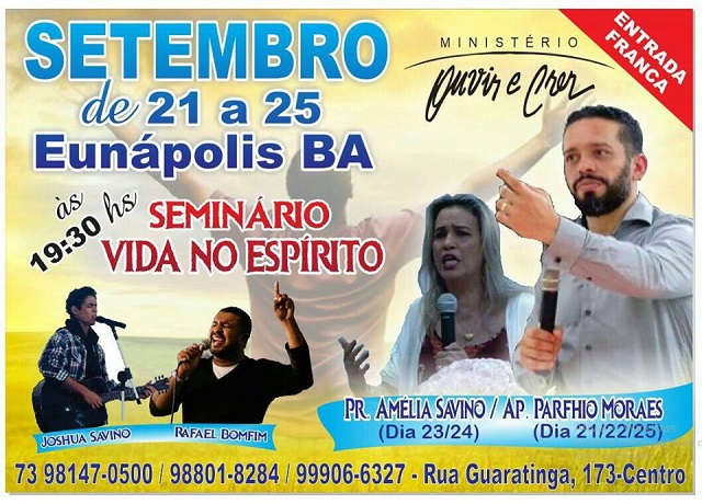 O Seminário Vida no Espírito, do Ministério Ouvir e Crer, começará na próxima quarta-feira, 21 de setembro. Com entrada franca, o evento vai até o dia 25, na Rua Guaratinga, n° 173, centro de Eunápolis.