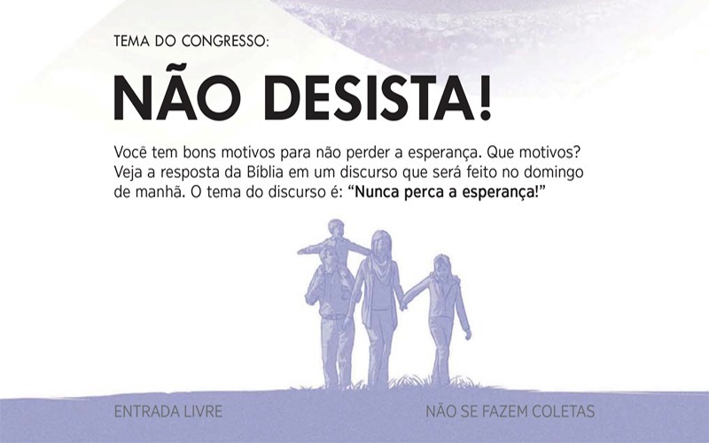 “NÃO DESISTA!” Esse é o tema do Congresso de 2017 das Testemunhas de Jeová que tem o prazer de convida-lo para assistir a esse evento de três dias que será realizado nos dias 28-30/7/2017! Nesse evento veremos como podemos ter uma vida feliz agora e olhar com otimismo para o futuro.