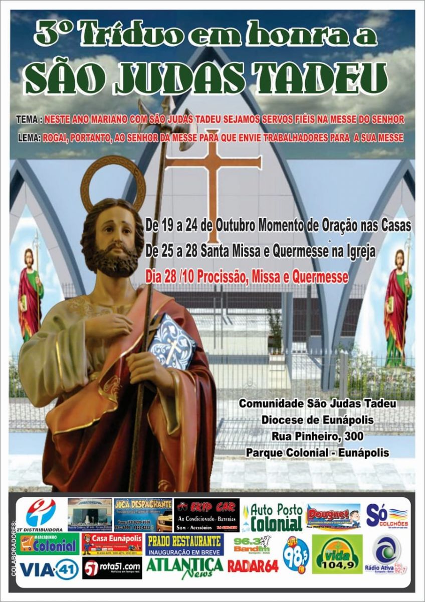 A Comunidade São Judas Tadeu de Eunápolis vai celebrar o 3º Tríduo em honra ao santo a partir do dia 19 de outubro com oração nas casas até o dia 24. Do dia 25 a 28, haverá Santa Missa e quermesse na igreja, localizada na Rua Pinheiro, no Parque Colonial. Tradicionalmente, o último dia também tem procissão.