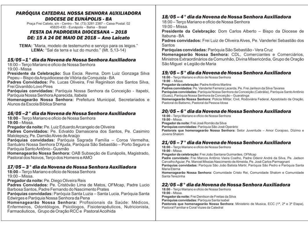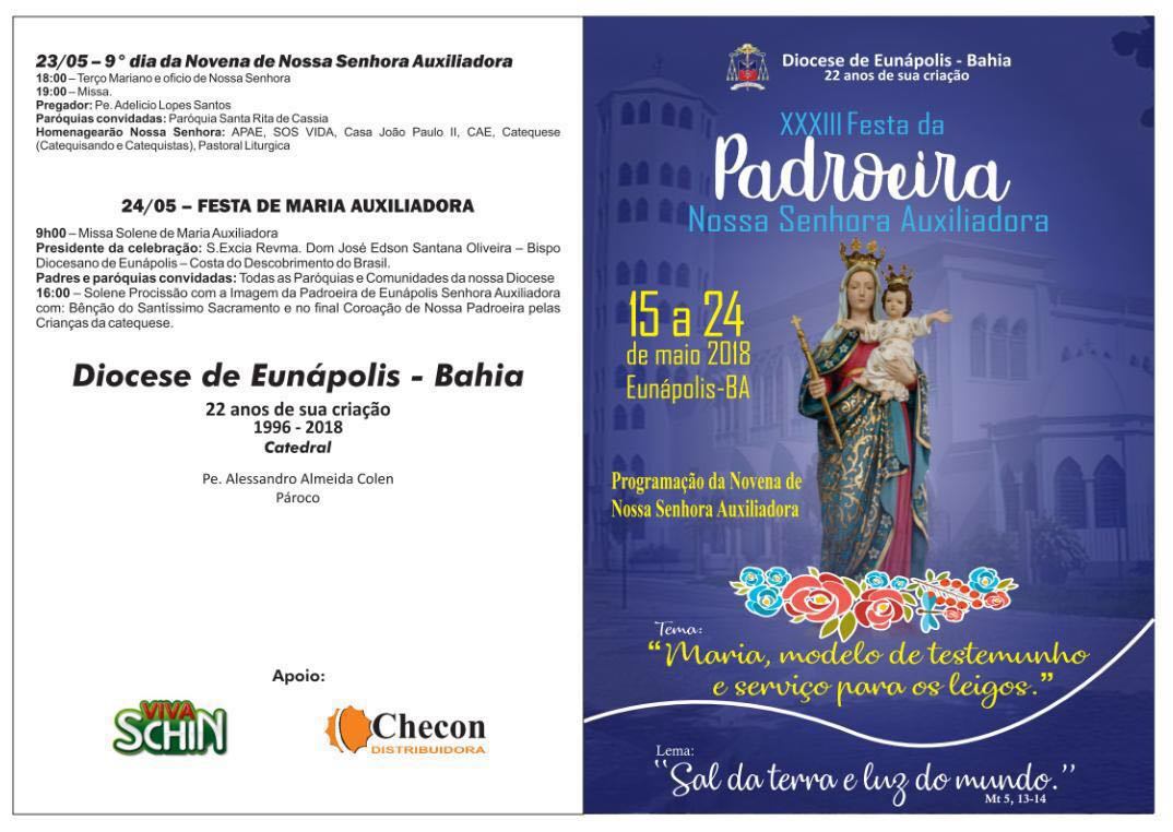 A 33ª Festa da Padroeira de Eunápolis Nossa Senhora Auxiliadora, que está sendo celebrada por seus fiéis desde o dia 15 de maio, segue com a novena até a próxima quarta-feira (23). Na quinta (24), dia de Nossa Senhora, haverá missa às 9h e procissão às 16h.