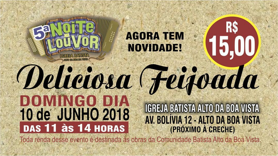 A Comunidade Batista Alto da Boa Vista convida toda população eunapolitana para o evento comunitário e de comunhão, com o intuito de concluir o processo de aquisição do terreno onde será construída a Igreja, e assim, trabalhar com projetos comunitários oportunizando toda a comunidade.