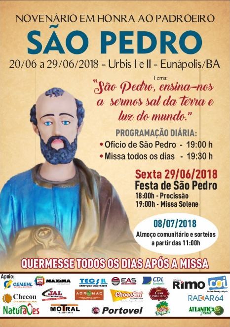 A Festa em honra ao glorioso São Pedro, Padroeiro da paróquia São Pedro terá este ano como tema: “São Pedro, ensina-nos a sermos sal da terra e luz do mundo”. A novena inicia nesta Quarta-Feira (20), e segue até dia 29. Cada noite com um sacerdote diferente, comunidades abrilhantando a liturgia e expressando a fé fundamentada pelos apóstolos.