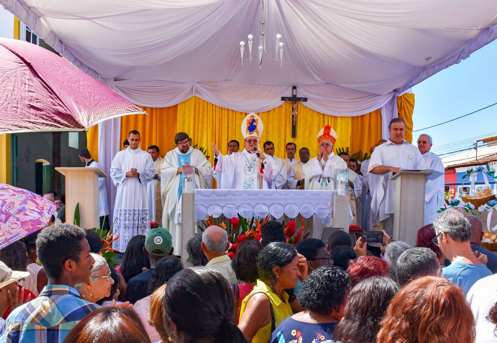 Durante a celebração, o bispo cumprimentou os religiosos presentes na pessoa do padre Casemiro, e as autoridades, na pessoa da prefeita. D. Edson lembrou os 469 anos da romaria mais antiga do Brasil. “Vamos para os 470 anos de bênçãos e graças no Santuário de Arraial d´Ajuda. Imagine quantos romeiros já passaram por aqui, nesse lugar mais alto, nessa colina sagrada, levando o nome de Porto Seguro e Arraial para tantos lugares!”.