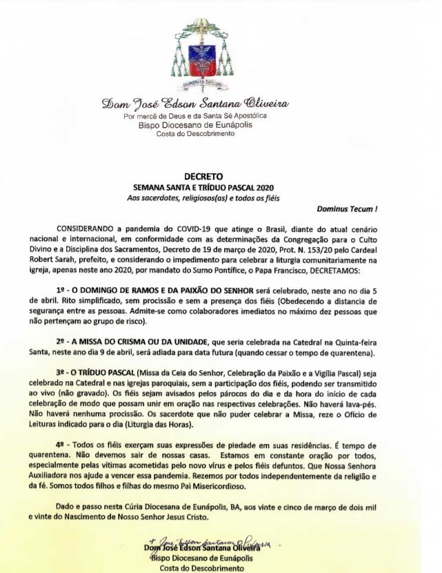 As alterações, frisa, ocorrem “diante do atual cenário nacional e internacional, em conformidade com as determinações da Congregação para o Culto Divino e a Disciplina dos Sacramentos, decreto de 19 de março de 2020, Prot. N. 153/20 pelo Cardeal Robert Sarah, prefeito, e considerando o impedimento para celebrar a liturgia comunitariamente na igreja, apenas neste ano 2020, por mandato do Sumo Pontífice, o Papa Francisco”.