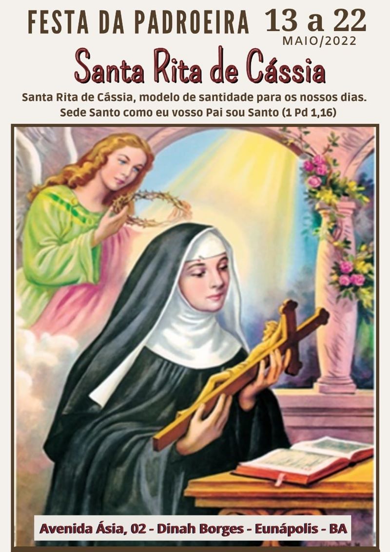 Começa no próximo dia 13 a Festa da Padroeira Santa Rita de Cássia, que vai até o dia 22 deste mês. A Paróquia Santa Rita de Cássia em Eunápolis anunciou a programação das celebrações. Todos os dias, às 19h, haverá missa e confraternização com as famílias.