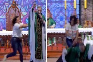 Mulher empurra padre Marcelo Rossi de palco durante missa