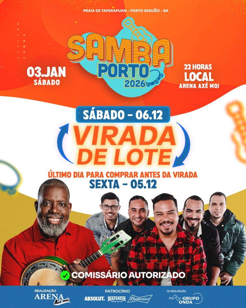 Se você quer aproveitar uma noite de verão ao som de muito samba e pagode, garanta agora mesmo sua presença no Samba Porto Axé Moi 2026 a preço de segundo lote, até o dia 05 de dezembro. A partir do dia 06 de dezembro haverá mudança de lote e de valores.